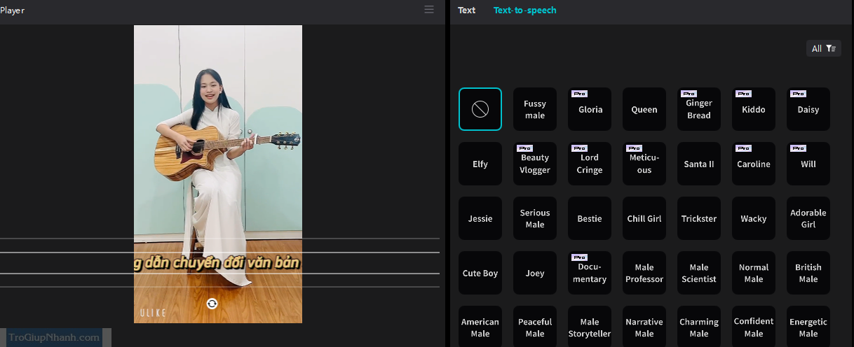 Bạn có thể lựa chọn giọng nói và nghe thử trước khi áp dụng cho video của mình. Với bản Capcut Pro thì các bạn sẽ có nhiều giọng nói hơn.
